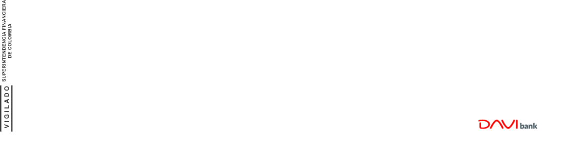 ®Marca registrada de Davivienda Group, utilizada bajo licencia DAVIbank. DAVIbank Establecimiento Bancario. Seguros voluntarios prestados por BNP Paribas Cardif asume exclusivamente la responsabilidad del cumplimiento de las obligaciones relacionadas con el contrato de seguro frente al cliente, así como de la operación y servicios adicionales ofrecido. DAVIbank S.A. no actúa ni como intermediario de seguros, ni como compañía aseguradora. El cumplimiento del contrato de seguros es responsabilidad directa de la compañía aseguradora, quien emite la póliza. "Las tarifas indicadas se encuentran vigentes a partir del 15 de enero de 2025".